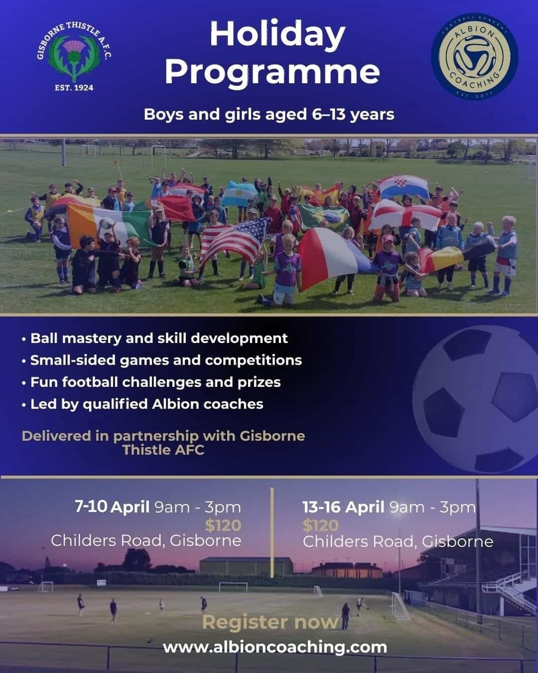 Our Albion Holiday Programs offer an exciting and engaging football experience for players of all levels during the school holidays in Gisborne. Designed to be fun, dynamic, and challenging, our programs create an environment where players can develop their skills, build confidence, and make lasting friendships—all while playing the game they love.
